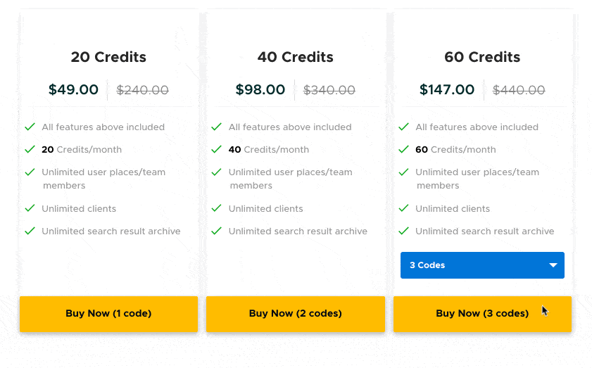 To make life easier for you, we’ve built a pricing table that shows exactly what comes with each code. When selecting more than 3 codes from the dropdown menu, features update instantly and so does your shopping cart!