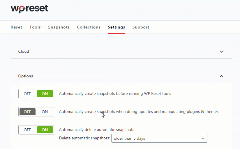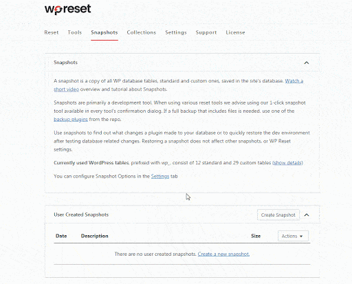 Unlike conventional backups, WP Reset’s snapshots are much faster because they only keep a copy of your database and the plugin or theme files that have changed. Snapshots are much leaner and faster to work with. On an average site, restoring a snapshot only takes about ten seconds.