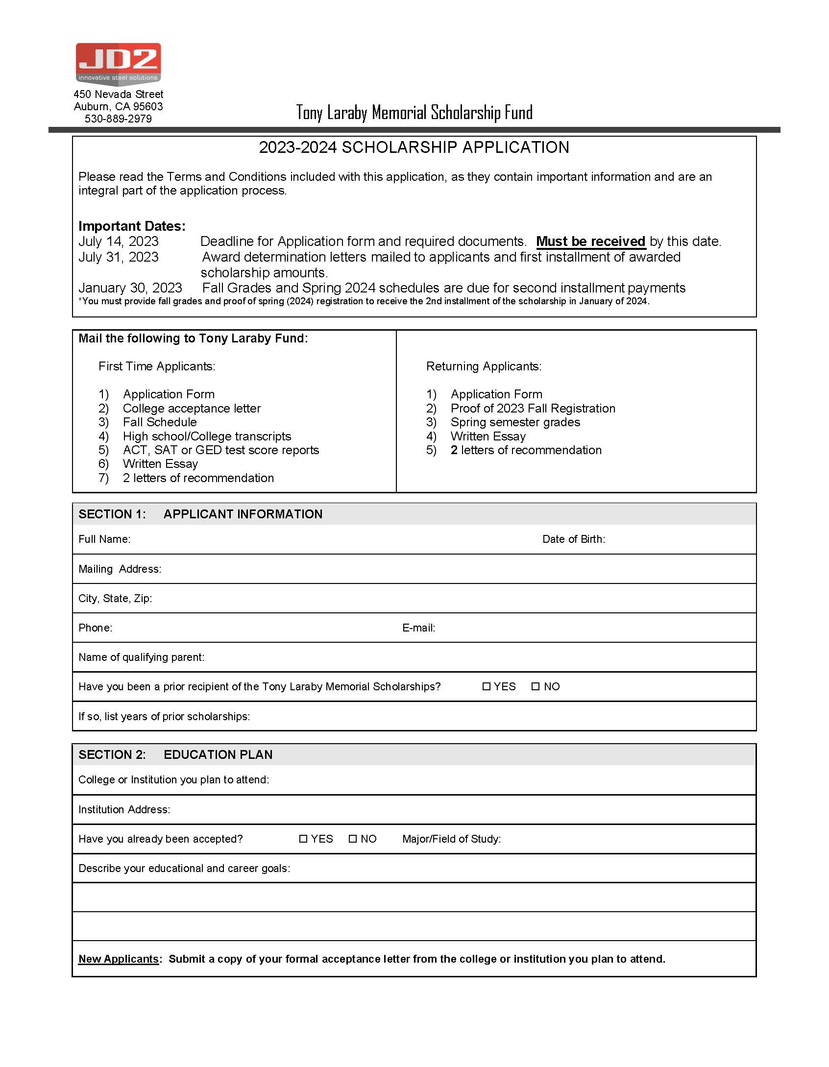 For more details about the Tony Laraby Memorial Fund, please feel free to contact Deborah Broadway at (530) 889-2979 or TonyLarabyFund@jd2inc.com.