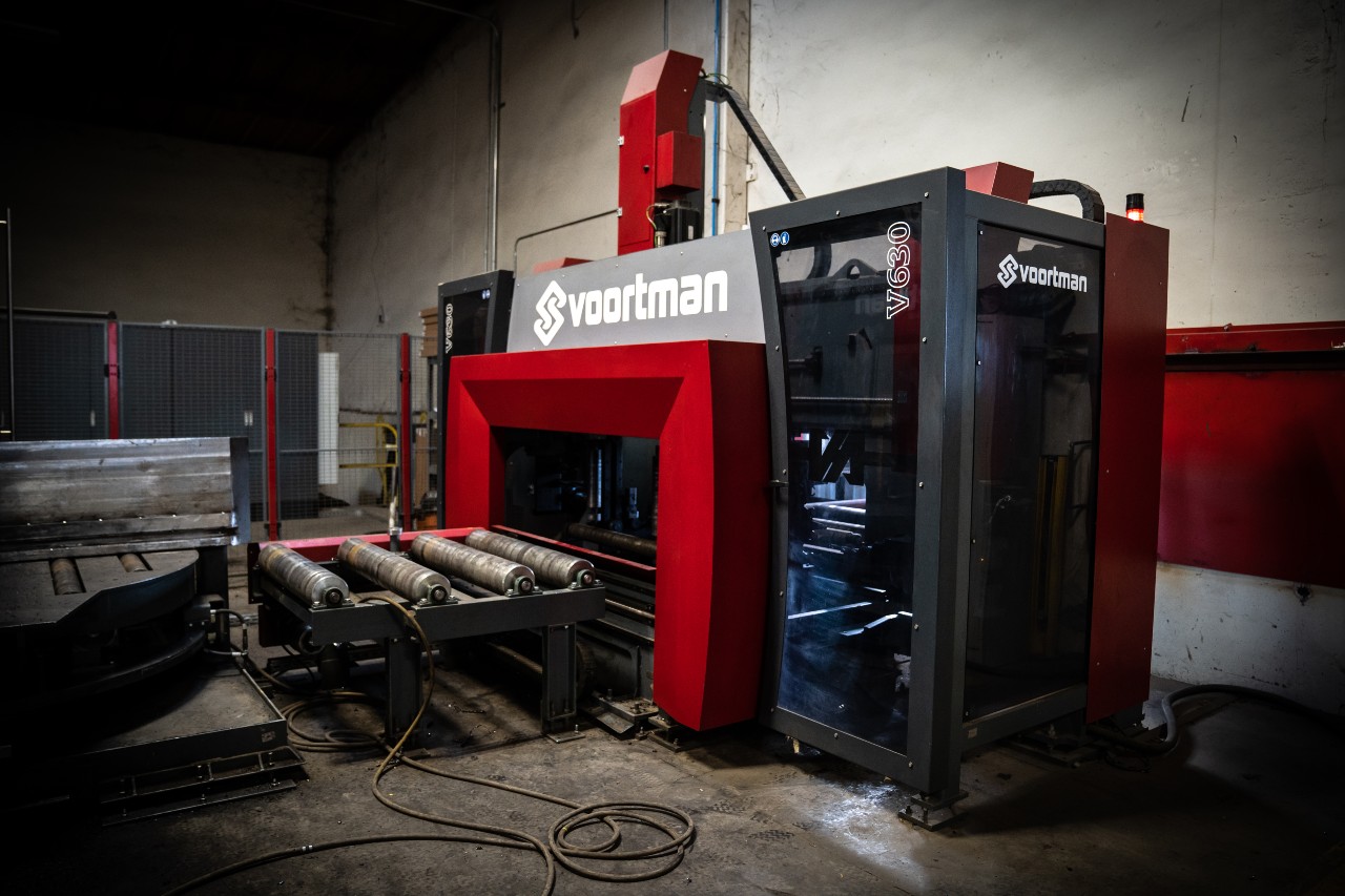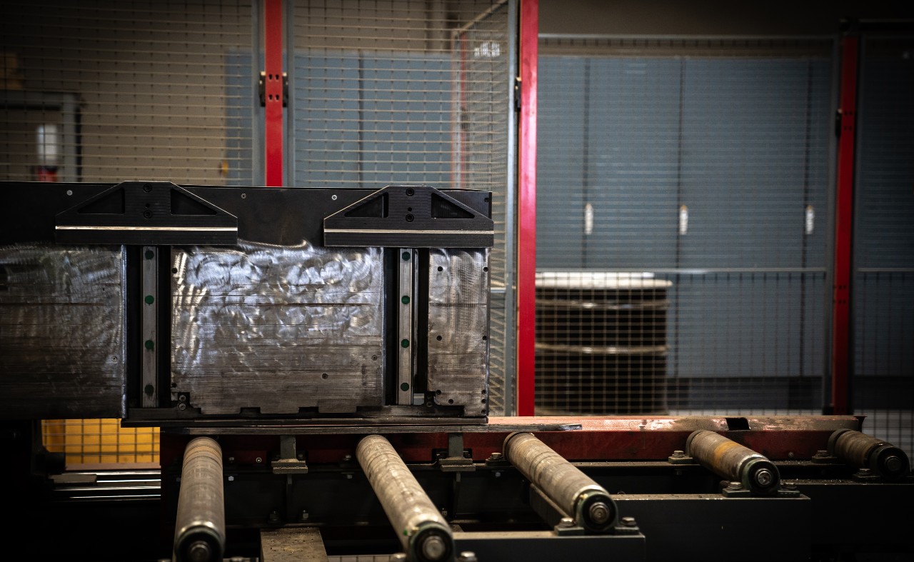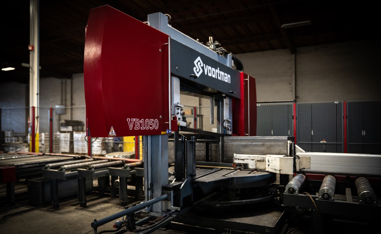Our 40" CNC Band Saw, capable of cutting 40" X 397 lb steel beams up to 65' long, with pitch cuts from 45° to 60°, and a small parts and trim cut remover.