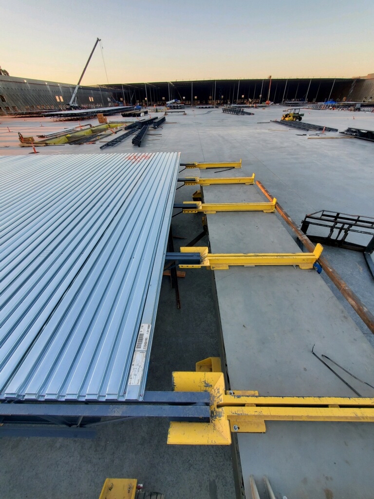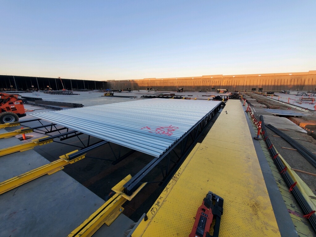 Joist bridging equipment, support steel, and metal deck are all assembled into the completed panel in The Racker and the entire panel is hoisted in just one lift.